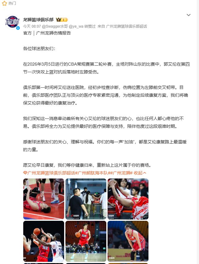 3月6日,龙狮篮球俱乐部发布了郭艾伦伤情报告,全文如下: