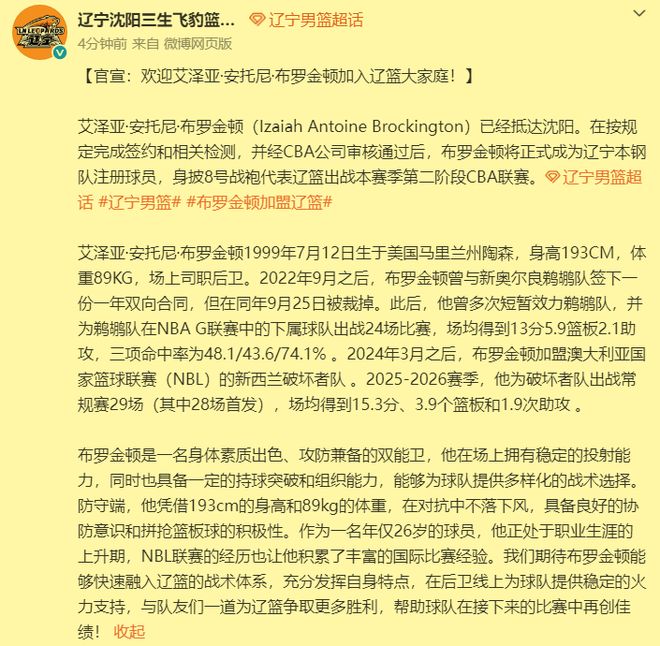 上午9点官宣!辽篮正式与布罗金顿签约,期待他在第二阶段的表现!