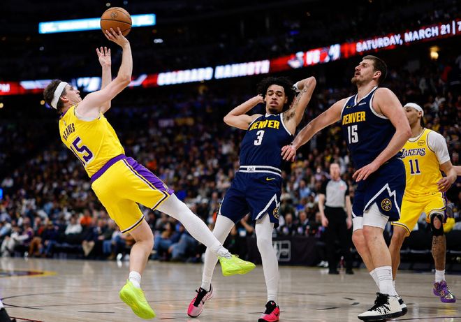 还有呢,就赢下的这4场比赛,里面也有水分!两胜森林狼+一胜马刺,不好意思,老詹都不在!那就不是完全体湖人,作为季后赛参照,就没太大意义,毕竟季后赛你不可能不让老詹上场,对吧?赢掘金那场,约基奇不在,穆雷带着一套残阵。
