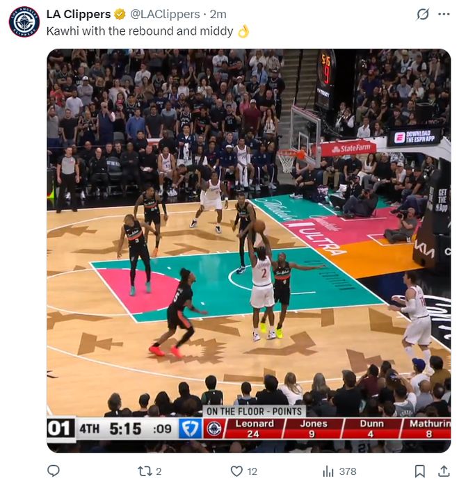 此役的快船依旧艰难,加兰、科林斯、尼德豪泽、波格丹等核心轮换都无法登场,伦纳德是唯一被倚重的核心,好在小琼斯首节命中2个三分球帮助小卡分忧,首节伦纳德只有3中1,三分2中0拿到4分3篮板1助攻。