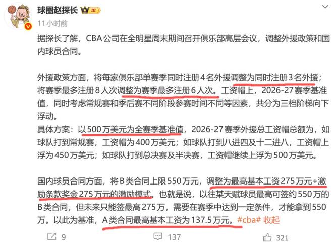据媒体人球圈赵探长透露,下赛季CBA可能只能同时注册三名外援,单赛季注册不能超过6次,且又要恢复到4节6人次(这两年都是4节7人次)。另外,外援工资帽改为浮动值,打到半决赛和决赛的工资帽为500万美元,最低一档的也就是没进季后赛的为400万美元。而本土球员工资B类合同不能直接签550万,而是改为封顶275万+附带激励条款(最高也能到275万)。