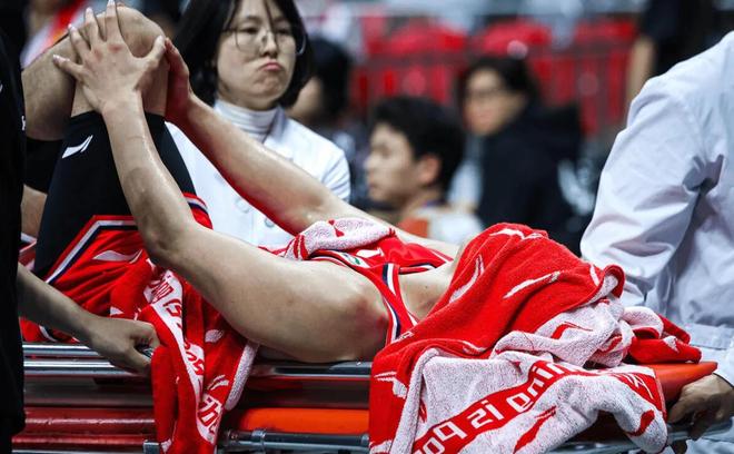 倒下后的他,蜷缩在地板上许久,最终被担架抬出赛场。