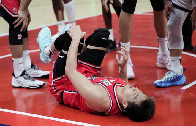在一次快攻上篮对抗后落地时,33岁的郭艾伦不慎倒地。