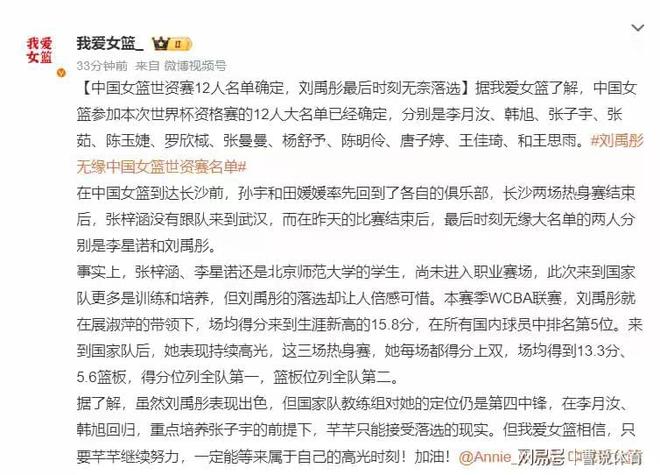 场均13.5分,5.6篮板,得分全队最高的刘禹彤被弃用,宫鲁鸣咋想的?万众瞩目的女篮世预赛即将打响,相信很多球迷都看到了中国女篮官宣了最终的十二人大名单,其中大宝贝刘禹彤被弃用,引起了很多球迷的热议,刘禹彤具备出色的力量优势,同时打球非常有激情,被很多球迷喜欢,如今落选宫鲁鸣的球队,很多球迷替刘禹彤感到委屈。