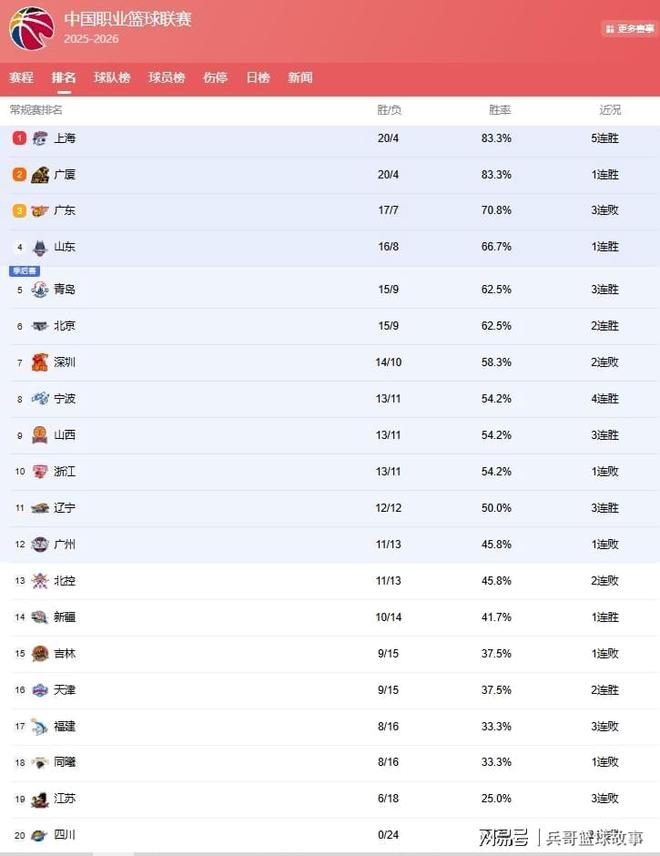 相比于上赛季广厦队一枝独秀,本赛季他们是遇到对手了,目前,上海和广厦同为20胜4负,不过上海队靠着胜负关系的优势,力压广厦高居第1位!上海和广厦本赛季表现都很出色,2队也都有拿下第1的机会,不过从现在来看,上海队可能更高!
