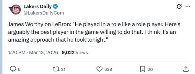 湖人名宿沃西赛后更是一针见血的表示:“詹姆斯打得像一个角色球员一样,作为联盟中最出色的球员之一,却愿意接受这样的改变,我认为他今晚的态度真的非常了不起。”