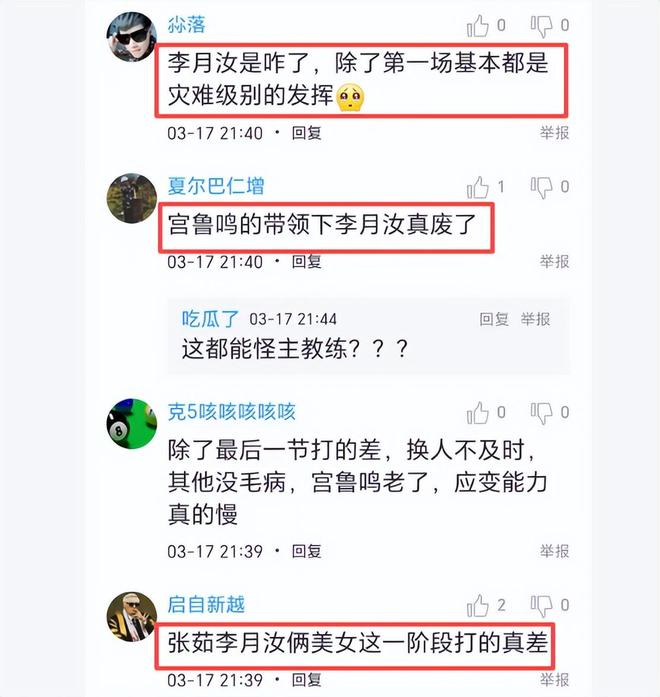 奇怪的是,昨晚在赛后采访中,李月汝怪教练宫鲁鸣不会用她,她也不解教练的战术。他原话这样说:可能需要我们教练更清楚怎么把我放在更合适的位置,我也需要跟教练主动去沟通我应该在怎么样的时机出现在怎么样的位置,确实后面这几场球我也打得很别扭,我自己也打得不太高兴。李月汝能回到国内参加这次比赛,值得表扬。但是个人认为,她赛后这番话经不起分析,人家韩旭与李月汝是同一时间回到国内,为什么韩旭又能基本发挥出自己的正常水平?说白了能否出色发挥还是靠自己去把握,与教练的关系不大。