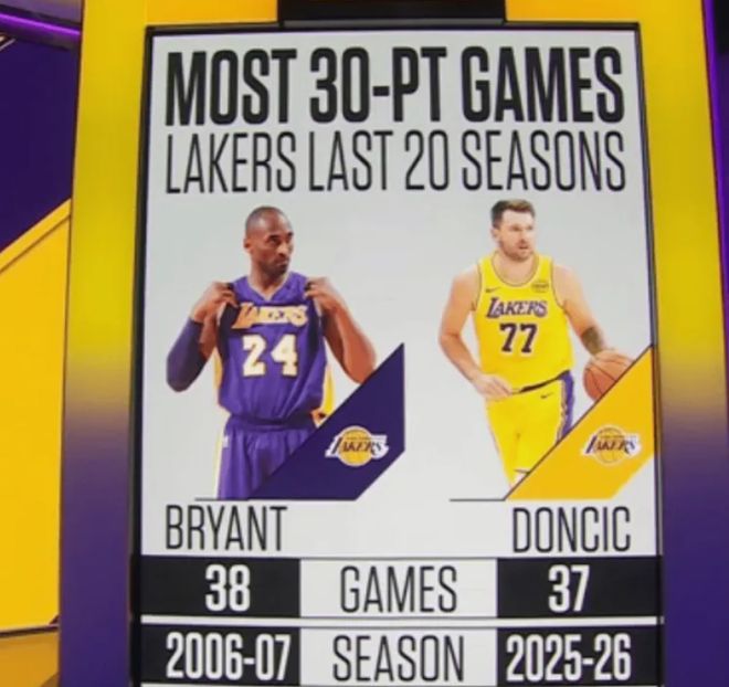 东契奇本赛季已经拿到第37次30+,过去20个赛季,仅次于科比06-07赛季的38次(05-06赛季的科比有56次30+是湖人队史纪录),东契奇本赛季场均32.9分也是联盟的得分王,他将成为科比后湖人队史又一位得分王。