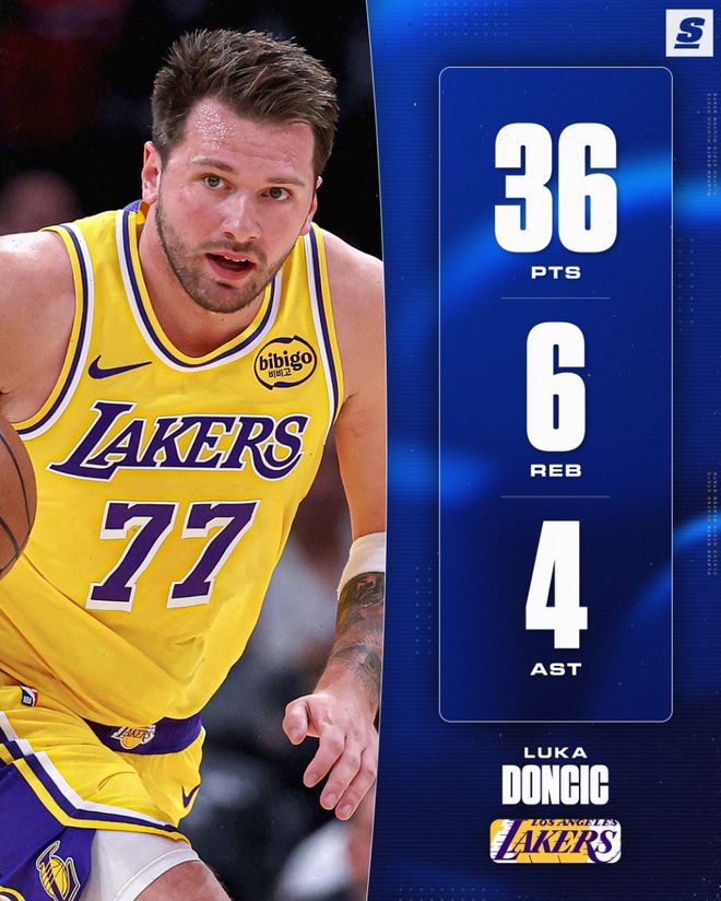 东契奇这场比赛40分钟,27中14,三分12中4,罚球5中4,拿到36分6篮板4助攻2抢断4失误,命中率51.9%,三分命中率33.3%,真实命中率61.6%,正负值+6。湖人全队才100分东契奇一人占比全队36%已经非常恐怖。