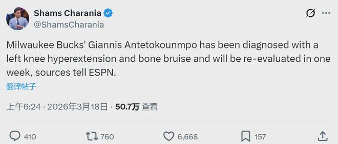 北京时间3月18日,据NBA名记Shams报道,雄鹿球星扬尼斯-阿德托昆博被诊断为左膝过度伸展和骨挫伤,将在1周后接受复查。常规赛仅剩3周多,如今雄鹿28胜39负仅排东部第11,落后第10黄蜂5.5个胜场,附加赛没什么希望了。