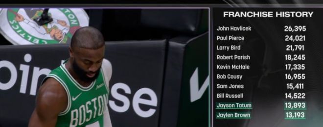 布朗生涯总得分连续超越乔乔-怀特与戴夫-考恩斯,跻身凯尔特人队史前十,前一位是塔图姆。