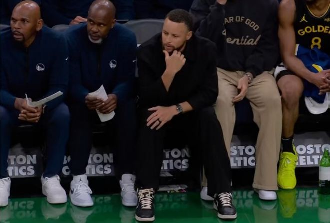 继续养伤的库里坐在场边观战,本场勇士缺少库里兄弟、巴特勒、穆迪、霍福德与克赖尔,凯尔特人缺少武切维奇。