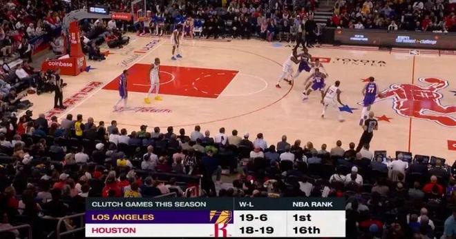 关键时刻湖人战绩19胜6负联盟第1,火箭18胜19负第16
