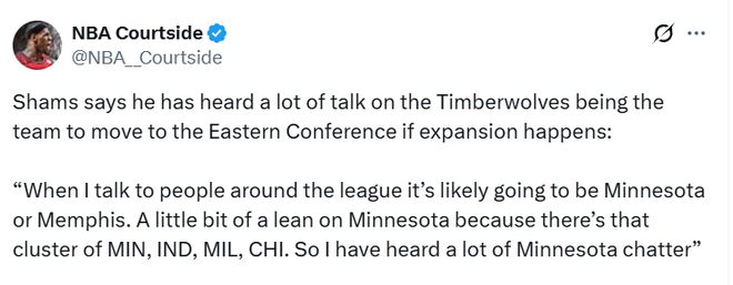 Shams在节目上说道:“跟NBA圈内人聊下来,大概率是森林狼或者灰熊,更偏向森林狼,因为地理位置:森林狼、雄鹿、步行者、公牛扎堆在中部。当然,灰熊、鹈鹕也觉得自己有理由。很多人问我:会不会有球队搬迁?我报道里也写了,大概率就是森林狼或灰熊。大家还在讨论扩军选秀、受保护球员名单。但说实话,这些都是两三年后的事,到时球员名单早就变了。不过扩军选秀那天一定会很好看。”