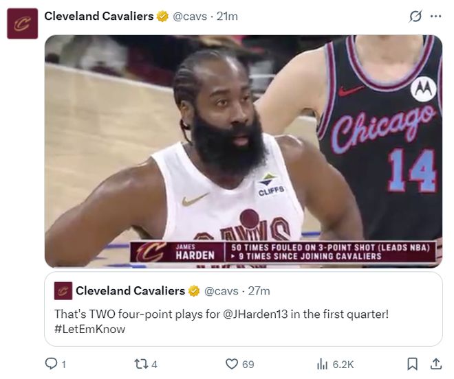 哈登已经在三分线外制造50次3+1领跑联盟,他到来骑士后已经制造了9次3+1,此役上半场就两个3+1。