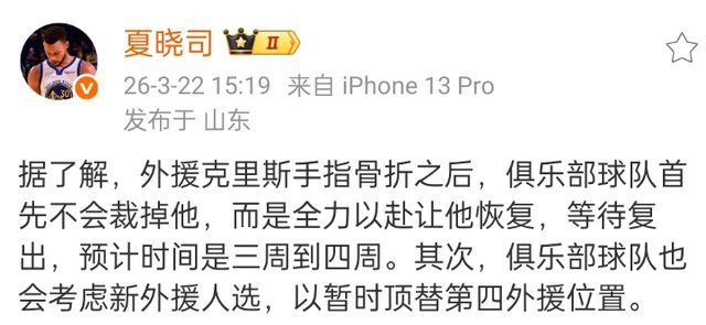 然而现在克里斯遭遇手部骨折,预计要缺席4周左右,关键受伤的还是投篮手,所以康复期肯定会更久一些,毕竟恢复训练后,还需要时间来寻找投篮的感觉。