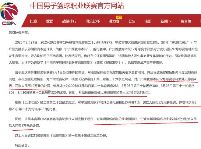 在刚刚,CBA公司开出了一份大罚单,对广州队球员李祥波罚款100000元+停赛4场。对宁波队球员鲁吐布拉罚款50000元+停赛1场,与此同时,对广州队副总经理、宁波队总经理也是进行了处罚。