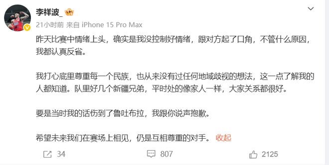 鲁吐布拉之后也是大方原谅了李祥波,以“互相尊重是底线,篮球让我们凝聚,期待未来继续在赛场上交锋”,结束了这场冲突。