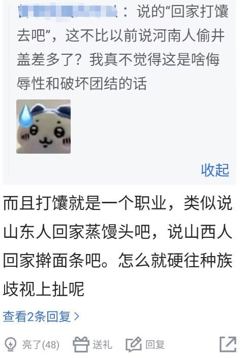 另一部分球迷则搬出了赵睿,认为李祥波这件事和赵睿那次相比,并没有想象中的那么严重:打馕就是一个职业,类似说山东人回家蒸馒头吧,说山西人回家擀面条吧。怎么就硬往种族歧视上扯呢?这都是赵睿惹的祸!