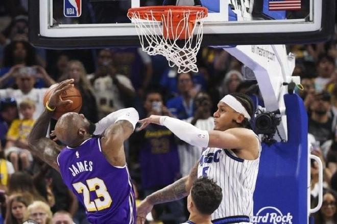 当魔术104-102领先,詹姆斯篮下接球准备攻筐时,班凯罗封下詹姆斯这次上篮后,球出界;随后进行了回看,结果是球没有被认定为最后打在詹姆斯脚上出界,所以湖人保住了球权。