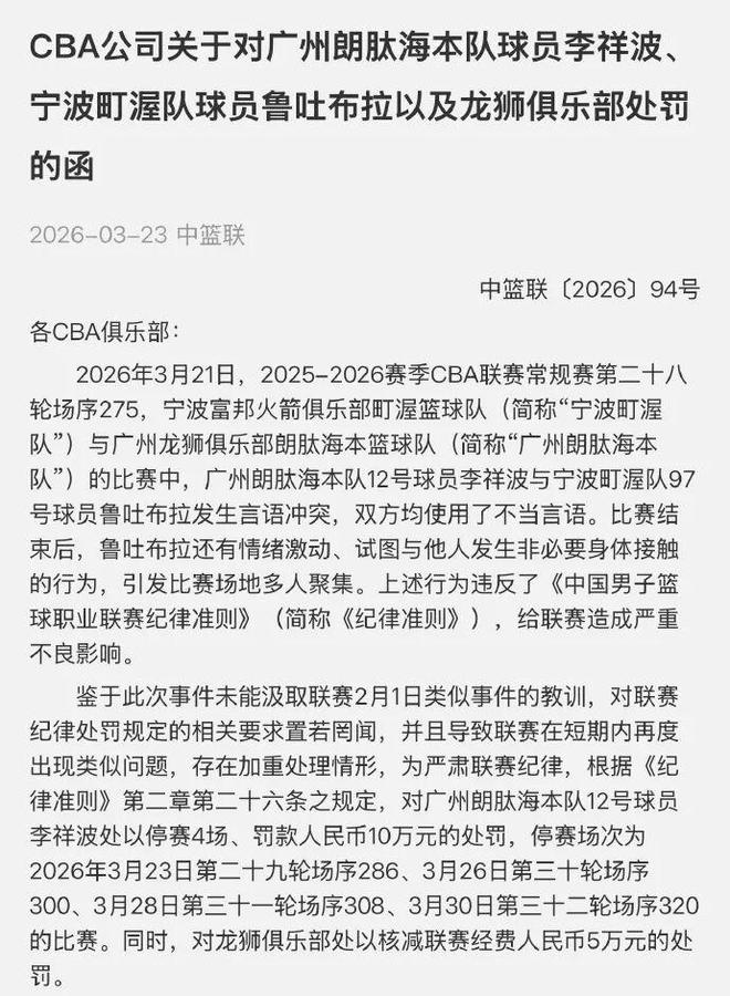 CBA官方宣布:李祥波停赛4场+罚款10万,鲁吐布拉停赛1场+罚款5万。