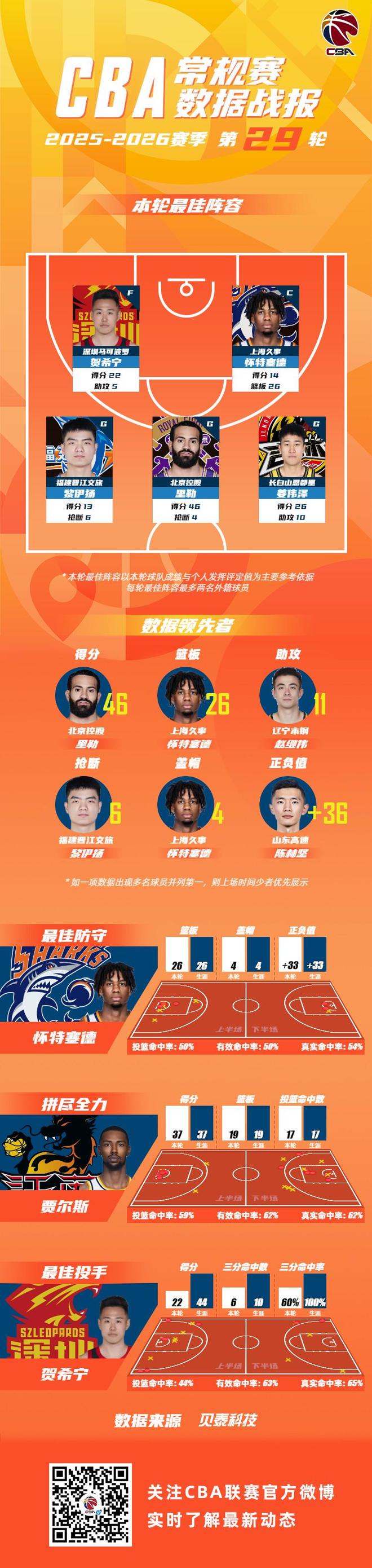 3月24日,CBA联赛官方公布常规赛第29轮最佳阵容,深圳男篮后卫贺希宁、上海男篮外援怀特塞德、福建男篮后卫黎伊扬、北控男篮外援里勒和吉林男篮后卫姜伟泽一同入选。