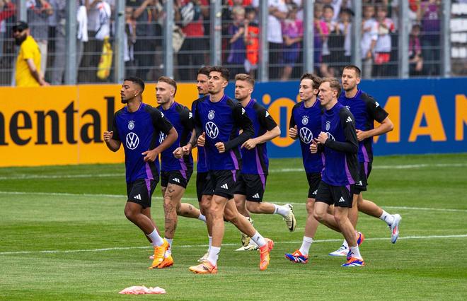 赖茨在一众德国国脚中奔跑,其中包括他未来在莱比锡的队友劳姆与亨里希斯。这张照片摄于2024年德国队欧洲杯备战期间,赖茨与未来的队友劳姆、亨里希斯同框。