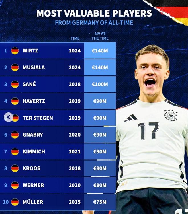北京时间3月31日,德转列出了德国球员历史身价榜,维尔茨和穆西亚拉同以1.4亿欧元并列第一,萨内1亿欧元第三,维尔纳上榜。