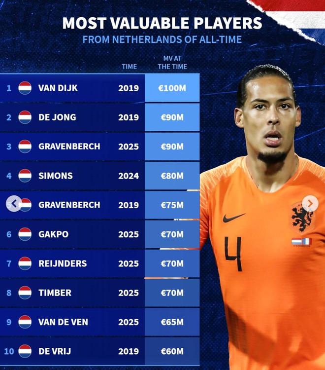 北京时间3月31日,德转列出了荷兰球员历史身价榜,范戴克1亿欧元并列第一,弗朗基-德容、赫拉芬贝赫9000万欧元并列第二。