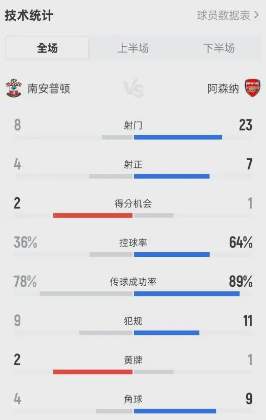 控球率64%,射门23比8,预期进球1.77比1.21。阿森纳把能占的优势全占了,唯独没占住比分牌。