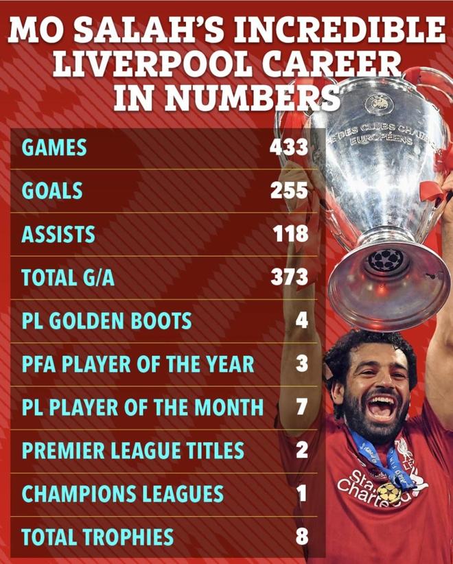 萨拉赫在利物浦拿到了8座沉甸甸的奖杯,其中包括分量最重的英超冠军和欧冠冠军。他终结了利物浦对顶级联赛冠军漫长的等待,把奖杯带回了安菲尔德。在欧战赛场,他为球队打入53球(欧冠48球),全是队史第一。
