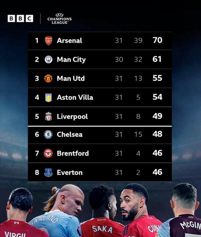 与此同时,因为下赛季欧冠有5个参赛名额,也意味着阿森纳提前7轮获得参赛资格。目前英超联赛已经进行到第31轮,阿森纳积70分,已经领先第6名的切尔西22分。