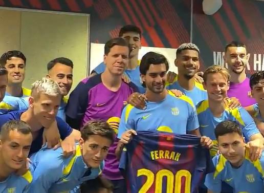 在西甲第31轮巴萨主场对阵西班牙人的赛前,费兰-托雷斯领取了200场纪念球衣,领取现场热闹非凡,众多一线队队友共同见证了这一荣耀时刻。