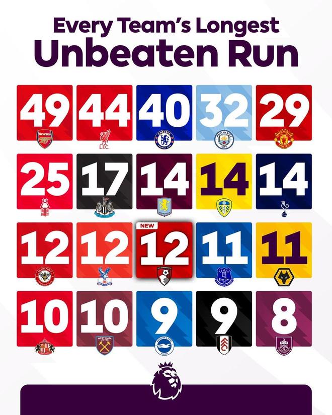 在伯恩茅斯创造队史英超最长不败纪录后,英超官方列出本赛季英超各支球队的历史英超最长不败纪录。