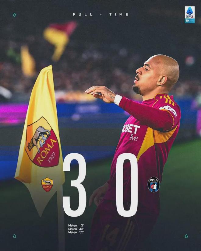 在这个夜晚,罗马3-0战胜了副班长比萨,但马伦赢得的不仅仅是3分,更是一份2500万欧元的身价证明,和一张通往欧冠的门票。
