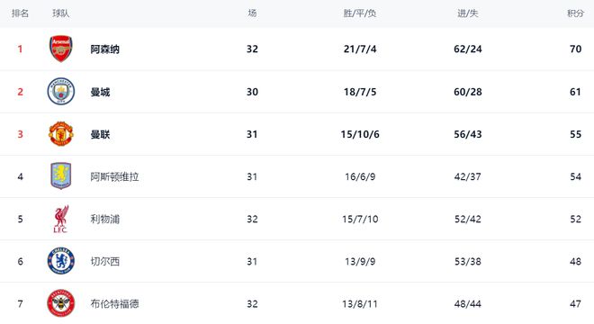 在积分榜上,落败的阿森纳依然占据榜首位置。阿森纳总积分是70分。曼城排名第2,拿到61分,落后阿森纳9分。不过,曼城比阿森纳少踢2场。冠军的归属还有悬念。曼联以55分排名第3。第4的是阿斯顿维拉,拿到54分。利物浦赢球之后,总积分达到52分,排名第5。切尔西48分排名第6。热刺的战绩是7胜9平15负,只拿到30分,掉入降级区,排名第18。