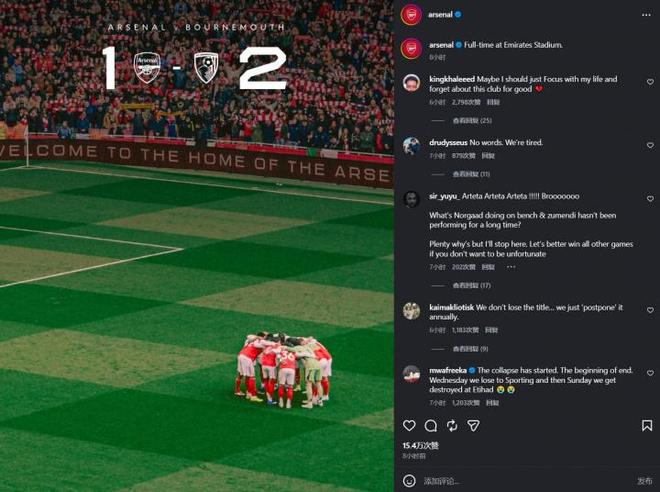 阿森纳本轮1-2不敌伯恩茅斯,先赛两场以9分优势领跑。赛后地阿森纳社媒官方战报,在评论区哪怕努力往下翻,也几乎找不到任何积极的言论,除了来看热闹的其他队球迷外,入眼之处尽是愤怒、哀叹的枪迷们。一些言论如下。