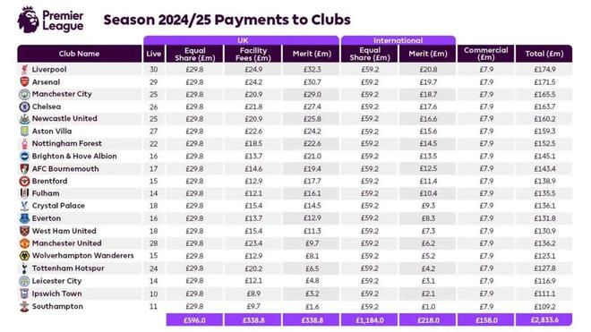 作为世界足坛商业价值的扛把子,英超官方于2023年宣布:将2025-2029赛季的转播权卖给skysport、TNT,集锦出售给BBC之后,四年内带来总计 67 亿英镑的收入。平均每年的转播收入就能达到约16.75亿英镑,而上赛季,英超的转播及商业总收入高达28.3亿英镑,而这笔钱的分配模式如下:50%基础收入(20支球队均分)+25%排名奖金+25%转播场次收入(设施费)。英超官方表示,这种模式确保了联赛中资金分配的公平性。