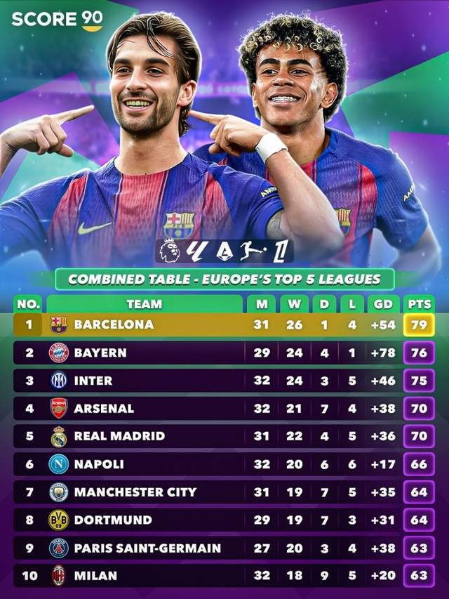 欧洲五大联赛已经进入最后冲刺阶段,Score90统计了五大联赛合并的积分榜,表格从左至右分别为比赛场数、胜、平、负、净胜球以及积分。巴萨以79分位居第一,拜仁第二,国米第三,阿森纳第四。