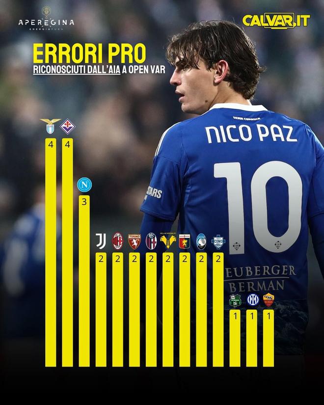 北京时间4月15日,意大利媒体Calvar.it统计出了本赛季至今意甲球队遭遇VAR误判的次数,尤文图斯5次位居第一,遭遇4次VAR误判的国际米兰目前仍以9分优势领跑积分榜。