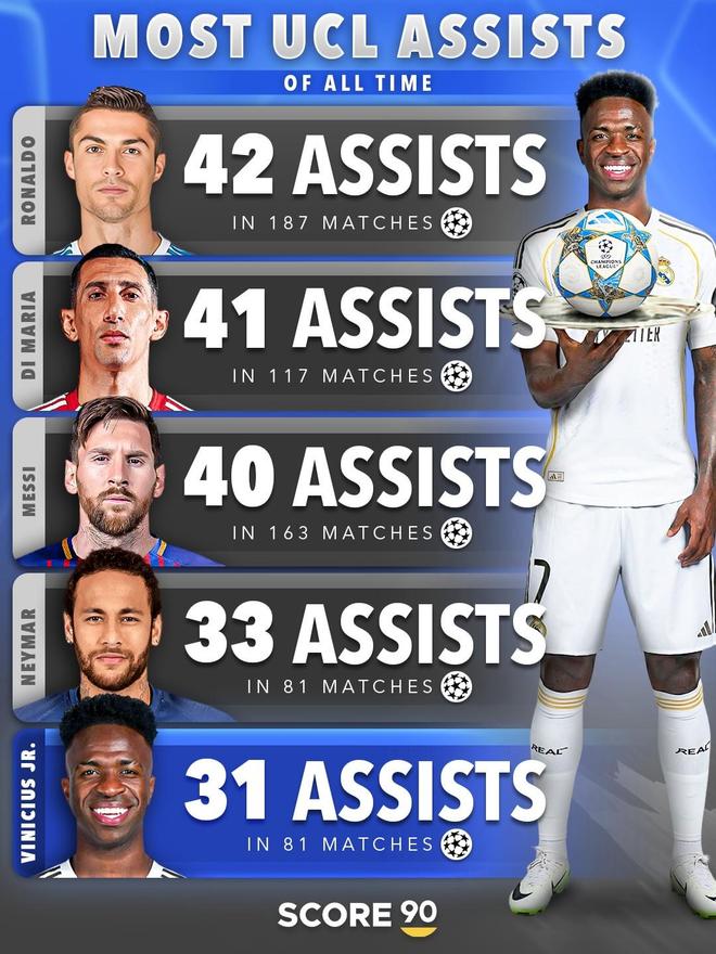 根据统计,到目前为止,维尼修斯已经在欧冠当中送出了31记助攻,位列欧冠历史助攻榜第5名。
