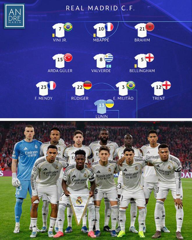 把皇马首发阵容摊开:巴西三叉戟、法国中场双核、英格兰贝林厄姆、乌克兰门将……11人来自9个国家,就是没有西班牙。