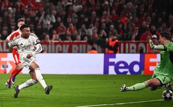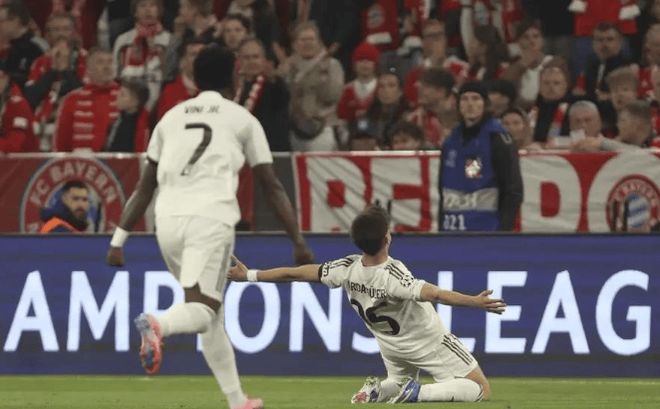 先看慕尼黑。首回合2-1领先的拜仁,回到主场却经历了一场史诗级对攻。上半场35秒,诺伊尔出球失误,居莱尔吊射空门,创皇马队史欧冠第二快进球;随后他再轰任意球世界波,29分钟完成梅开二度,成为首位在安联球场对拜仁双响的客队球员。姆巴佩推射破门,助皇马半场3-2反超,总比分4-4!