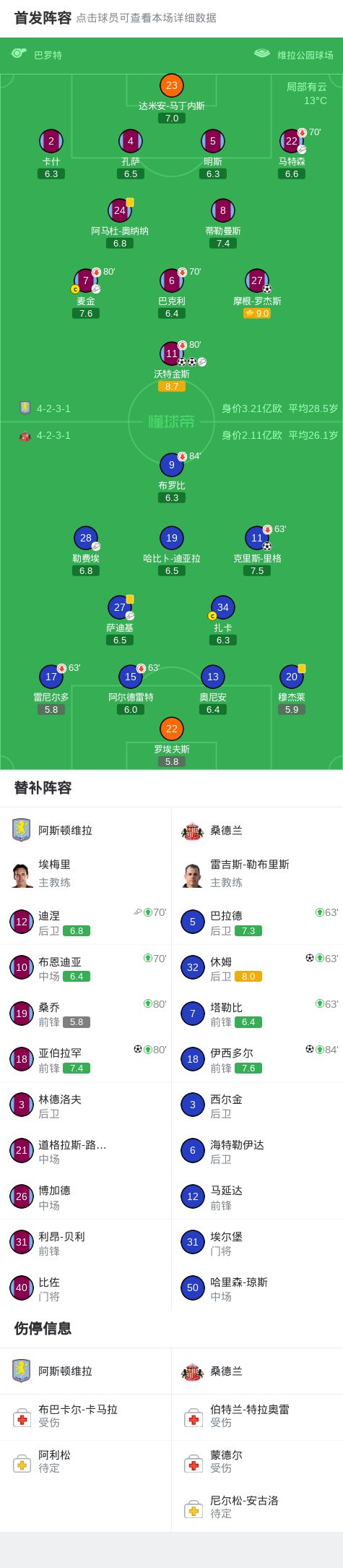 北京时间4月19日英格兰足球顶级联赛第33轮,阿斯顿维拉主场对阵桑德兰。沃特金斯2射1传,摩根-罗杰斯、亚伯拉罕破门。克里斯-里格、休姆、伊西多尔分别建功。最终比分阿斯顿维拉4-3桑德兰。
