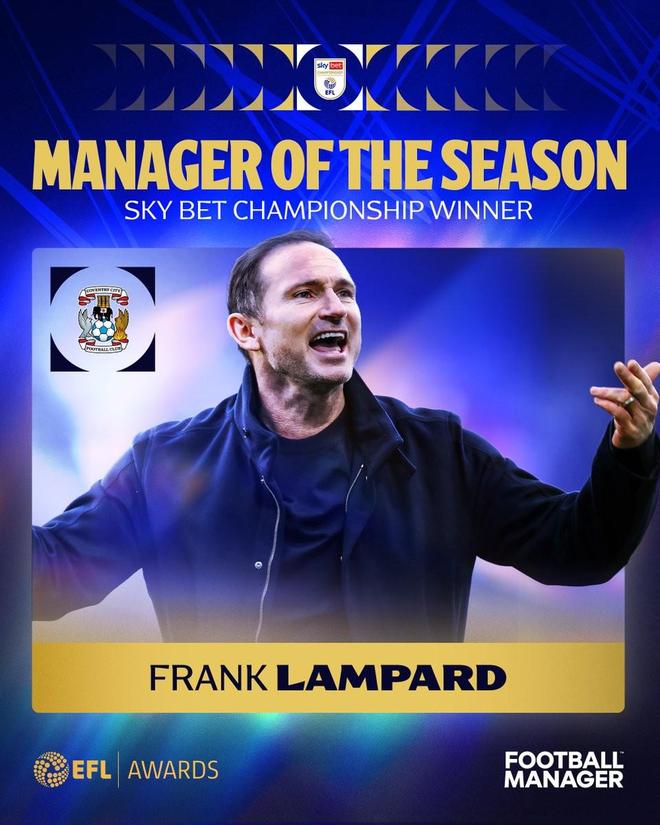 兰帕德在执教考文垂城的首个完整赛季中,带队重返英超,他因此被评为英冠赛季最佳主教练。