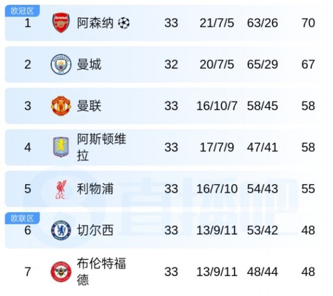 积分榜上,曼城少赛1场积67分仍居第2,阿森纳积70分继续领跑,但多赛一轮的他们,领先优势已被缩小至仅3分,英超争冠正式进入白热化阶段。