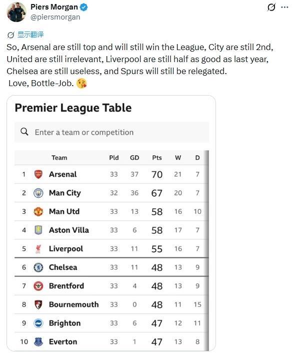 作为知名枪迷,摩根在社媒发文力挺阿森纳,他坚定表示:“阿森纳依旧稳居榜首,依然将赢得联赛冠军。曼城还是第二,曼联依然无关紧要;利物浦还是实力只剩去年一半;切尔西依旧一无是处;热刺依然迟早降级。”