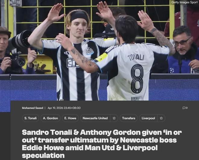 纽卡斯尔主帅埃迪-豪在新闻发布会上明确表示,托纳利和戈登必须决定他们“是走是留”,两人都被认为将在今夏转会离队。