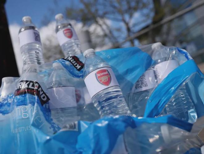 赛前印有阿森纳logo的瓶装水在伊蒂哈德球场外售卖,2英镑1瓶。