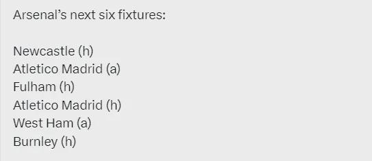 阿森纳未来6场比赛:主战纽卡斯尔、客战马竞、主战富勒姆、主战马竞、客战西汉姆、主战伯恩利。
